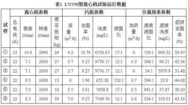 2010年10月底,公司選用麗水市恒力離心機械設備有限公司的LW350A型臥螺離心機對循環(huán)水污泥進行了定性試驗,LW350A型離心機的主要參數(shù)為:螺旋差速10~30r/min、轉(zhuǎn)鼓轉(zhuǎn)速2800r/min、電機功率55kW。絮凝劑選用濃度為1.5‰的陰離子型聚丙烯酰胺,試驗數(shù)據(jù)見表1。