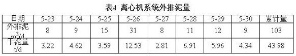 結(jié)合表3的運行數(shù)據(jù)可以看出,前段時間的調(diào)試取得了階段性的效果,隨著進機污泥含固率的降低,通過適當增加轉(zhuǎn)鼓轉(zhuǎn)速和減小差速,經(jīng)過離心脫水后的濾液液固比基本保持在80:1,泥餅含固率在48%左右,但相應的固體回收率低于50%。