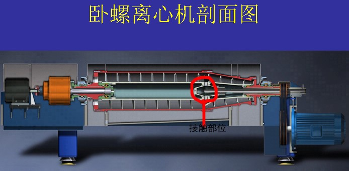 綜述:以上第4點(diǎn)是解決離心機(jī)運(yùn)行時(shí)的靜態(tài)耐磨措施,由于泥漿等硬質(zhì)廢水剛進(jìn)離心機(jī)有一定的沖擊磨損及動態(tài)磨損,從離心機(jī)剖面圖上可以看到,廢水是經(jīng)進(jìn)料管直接通到離心機(jī)紅圈部位(如圖1),此部位我們設(shè)計(jì)了凹槽結(jié)構(gòu),就是為了減少泥漿對初接面的沖擊力,經(jīng)此回流的低速廢水就可以安全處理了。在初接面的區(qū)域設(shè)計(jì)實(shí)心(如圖2),即便有沖擊磨損,實(shí)心區(qū)的材質(zhì)也足夠5年以上的磨損,離心機(jī)也得到最大限度的保護(hù)。