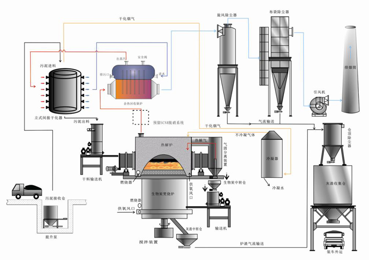 3、污泥進入熱解爐進行熱解,熱解后生物炭進入生物炭焚燒爐提取可用熱量,混合氣進入熱解爐膛燃燒,從熱解爐引來的燃燒后熱煙氣進入余熱回收裝置,產(chǎn)生蒸汽迅速返回至間接干化器夾層,通過間接加熱對污泥進行干化,干化后蒸汽變?yōu)闊崴赜?,引風機抽出的煙氣經(jīng)尾氣處理系統(tǒng)清潔凈化后,達標排放;