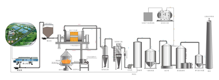 2、脫水污泥被輸送至干化器,通過直接與熱煙氣接觸,在干化器內(nèi)實(shí)現(xiàn)加熱和干化;經(jīng)干化后的物料與一定比例的輔助燃料充分混合后進(jìn)入立式清潔焚燒爐焚燒,干化后的尾氣經(jīng)尾氣處理系統(tǒng)清潔凈化后,無煙潔凈排放;